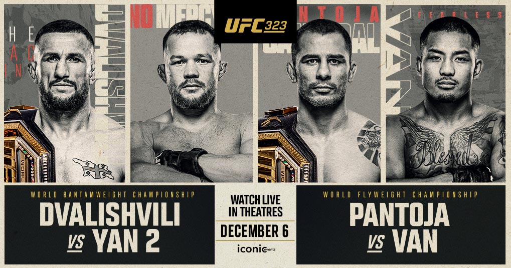The UFC’s final pay-per-view of the year wraps with a captivating clash for the bantamweight title as champion Merab “The Machine” Dvalishvili seeks to make his fourth successful title defense of the year as takes on former titleholder Petr “No Mercy” Yan, who has won three straight, in the main event of UFC 323 on Saturday, December 6 at T-Mobile Arena in Las Vegas. In the co-main event, flyweight ruler Alexandre “The Cannibal” Pantoja put his belt and eight-fight winning streak on the line against surging challenger Joshua “The Fearless” Van, who earned impressive victories over Bruno Silva and Brandon Royval in June to cement his standing as the No. 1 contender in the 125-pound weight class.ActionPT3H